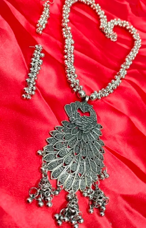 Tags: LONG NECKLACE, necklace, PARTY WEAR PEACOCK DESIGN NECKLACE, PEACOCK DESIGN, SILVER COLOUR NECKLACE, SILVER OXIDISED