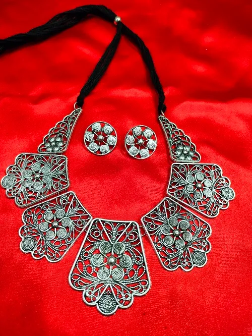 SILVER OXIDISED NECKLACE SET WITH SMALL STUDDS FOR PARTY AND CASUAL WEAR USE