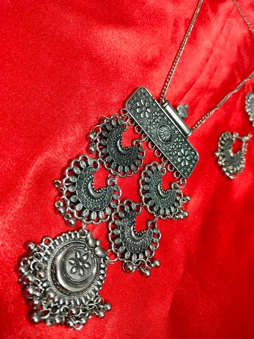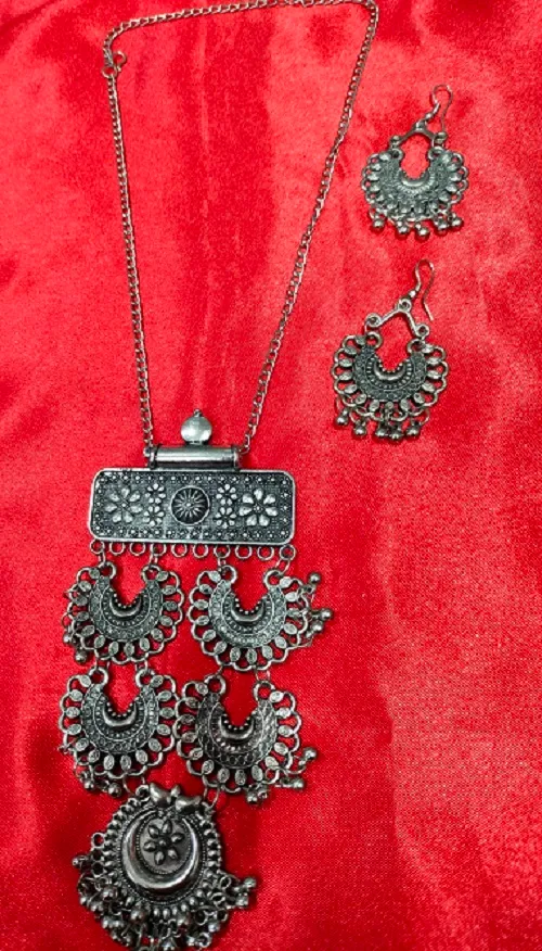 Tags: LONG NECKLACE, necklace, OXIDISED JEWELLERY, OXIDISED NECKLACE, SILVER COLOUR NECKLACE